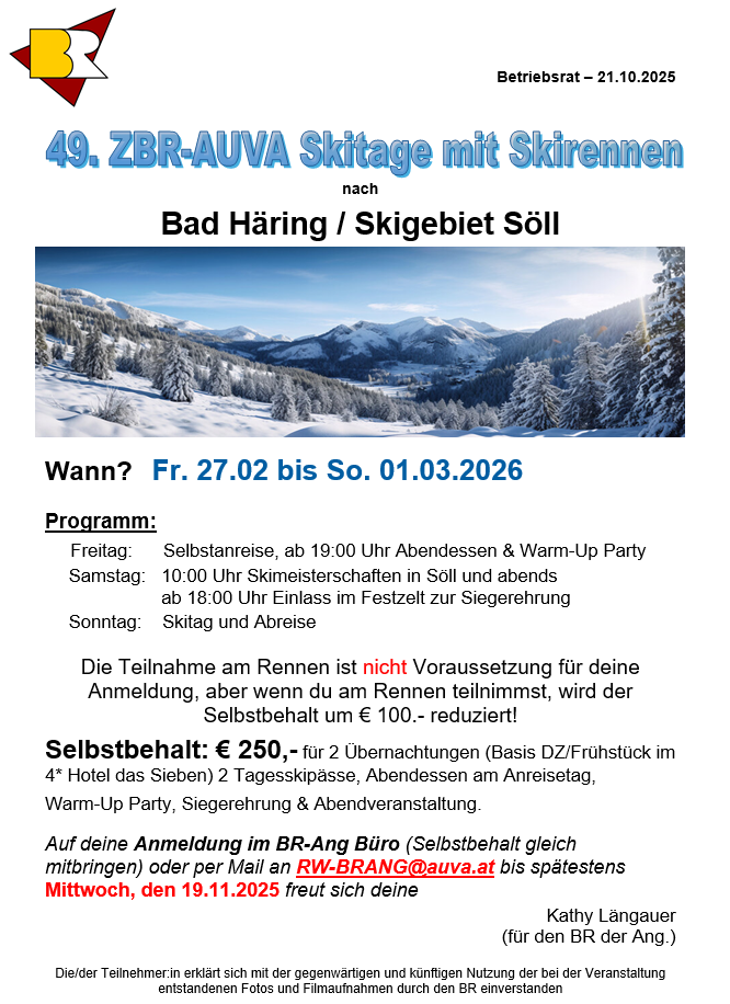49. ZBR-AUVA Skitage – Bad Häring Dieser Beitrag wurde am 21. Oktober 2025 von Ulrike Binder in Allgemeines, Veranstaltungen veröffentlicht.
