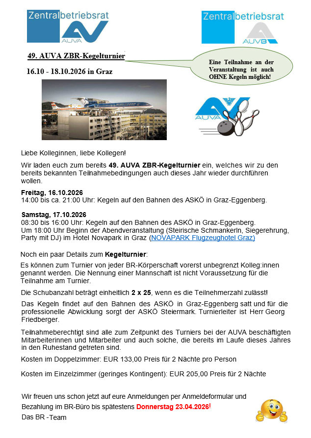 49. AUVA ZBR-Kegelturnier in Graz Dieser Beitrag wurde am 9. April 2026 von Ulrike Binder in Allgemeines, Veranstaltungen veröffentlicht.