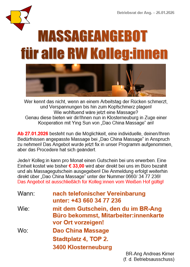 Anmeldungen unter: RW-BRANG@auva.at oder im BR-Büro